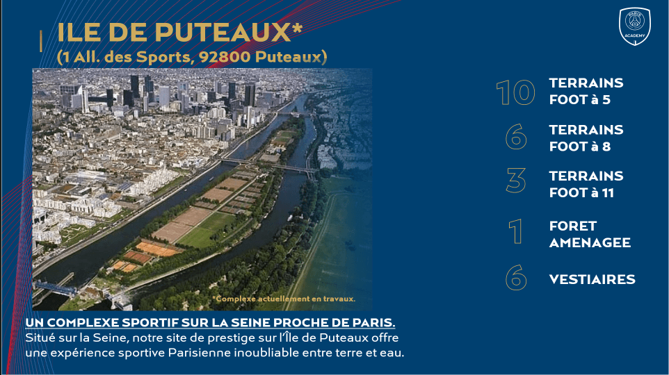 - El Campamento de Día en la Isla de Puteaux es de lunes a viernes (almuerzo diario incluido), la entrada es a las 9:30 h y la salida a las 16:30 h (16:30 h) o a las 17:30 h (17:30 h) si se reserva una sesión extra de entrenamiento para delanteros o porteros.
